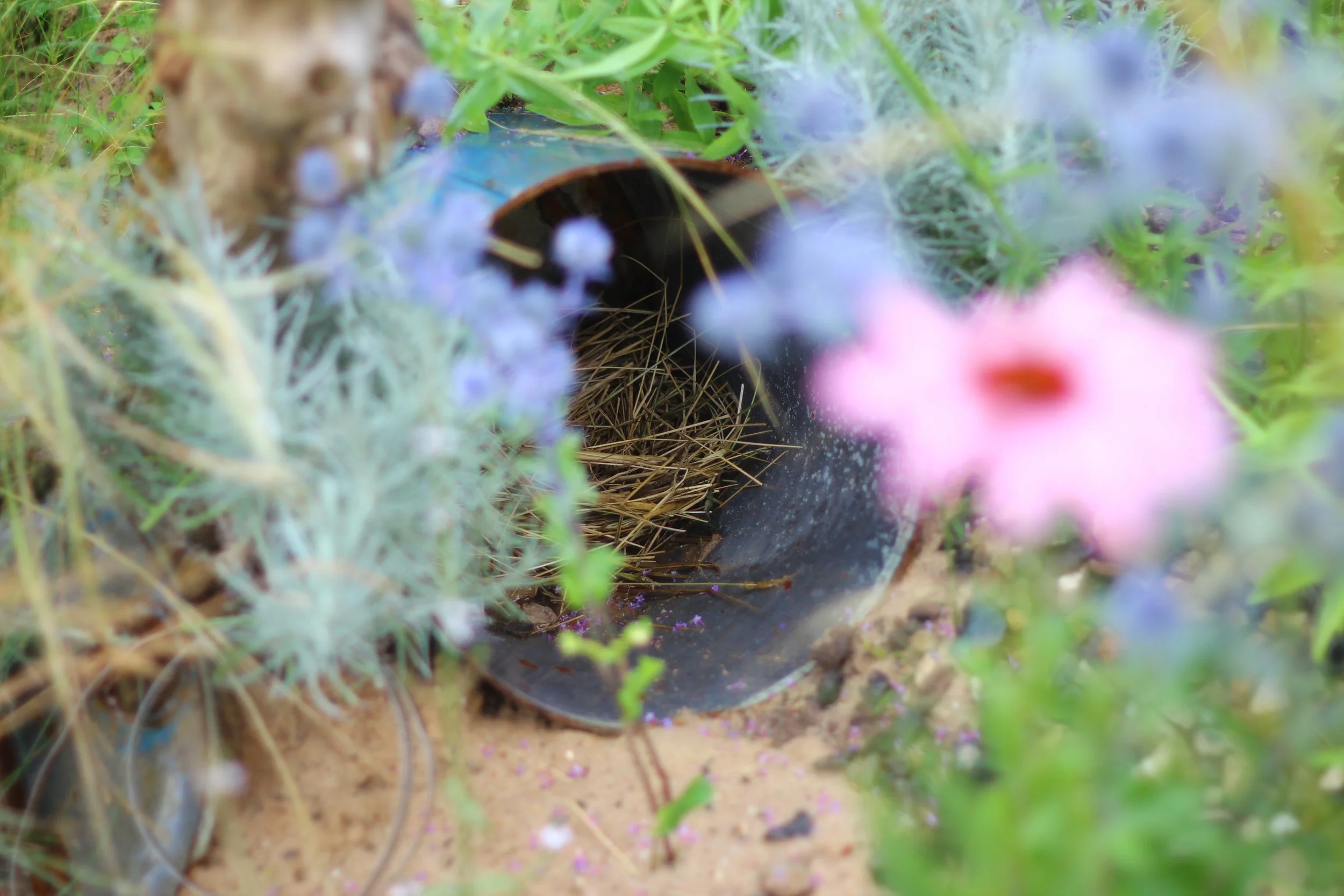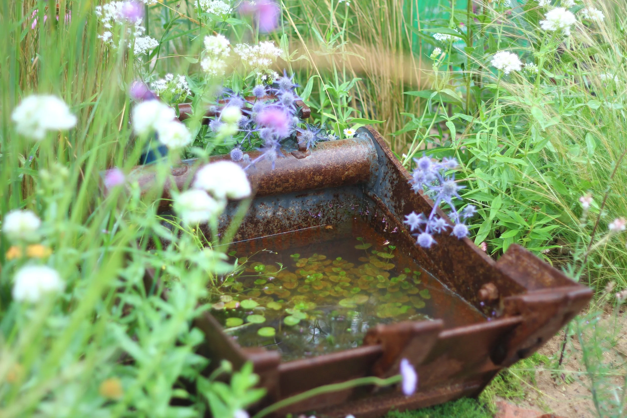Drawing on industrial heritage, the design incorporates reclaimed elements such as a digger bucket water feature, recycled aggregates, engine parts, and vintage oil drums, each adding texture and interest while providing valuable habitat. The planting reflects the patchy, low-nutrient conditions typical of post-industrial sites, supporting a diverse range of invertebrates. Bare ground and varied soil types mimic natural colonisation processes, creating opportunities for basking, burrowing, and nesting.